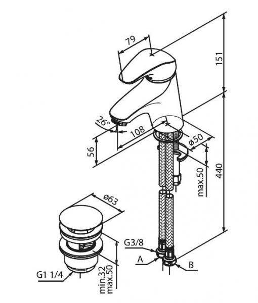 Damixa Space håndvaskbatteri med push-open bundventil. Keramisk regulering. Specifikationer: 120 mm fast tud