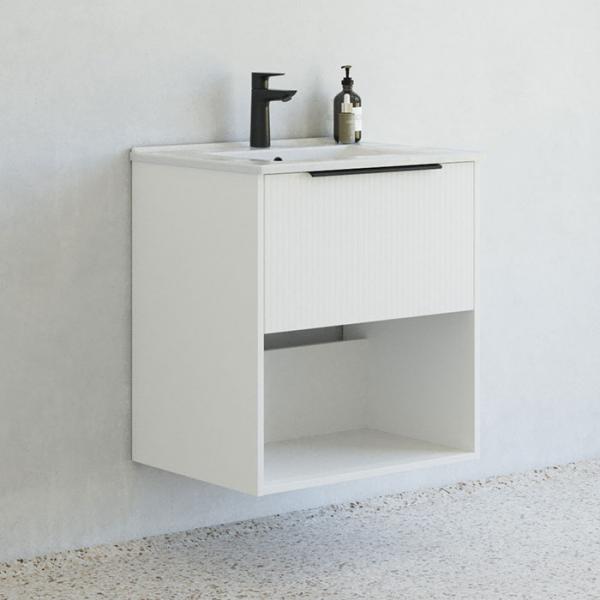 Dansani Mido+ Classic 61 møbelsæt m/Amber vask, 1 skuffe og åbent rum - Striber/mat hvid Dette komplette badeværelsesmøbel inkl. vask består af: