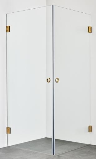Hafa Infinity brusehjørne Messing - 90x100 Eksklusivt brusehjørne med slankt beslag og en elegant håndtagsløsning. Vælg mellem tre farver, krom, mat sort eller børstet messing. De store glasoverflader giver et luftigt indtryk og skaber et dejligt rum i badeværelset. Dørene er vendbare og kan foldes ind i væggen, når de ikke er i brug, hvilket giver mulighed for at skabe et luksuriøst brusebad selv i et mindre badeværelse. Husk, at Infinity ikke har tætningslister som standard, så et korrekt gulvfald bliver ekstra vigtigt. Magnetliste inkluderet. Fuld højde 2000 mm og med 8 mm hærdet klart sikkerhedsglas.