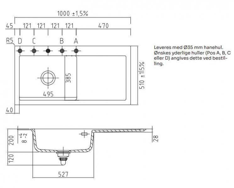 Lavabo Mera 100 SL porcelænskøkkenvask - Vask til venstre/krom afløb OBS: Min. 30 mm bordpladetykkelse. Mera 100 SL er en enkeltkummet vask med bakke til nedfældning. Vasken er et 100% naturprodukt bestående af ler og glasur. Udover det enkle og tidløse design har vasken en kanthøjde på kun ca. 8 mm, hvilket skaber en elegance og lethed. Materialet og produktionsmetoden gør at vasken både er antibakteriel, ridse- og syrefast. En meget slidstærk vask. Specifikationer: