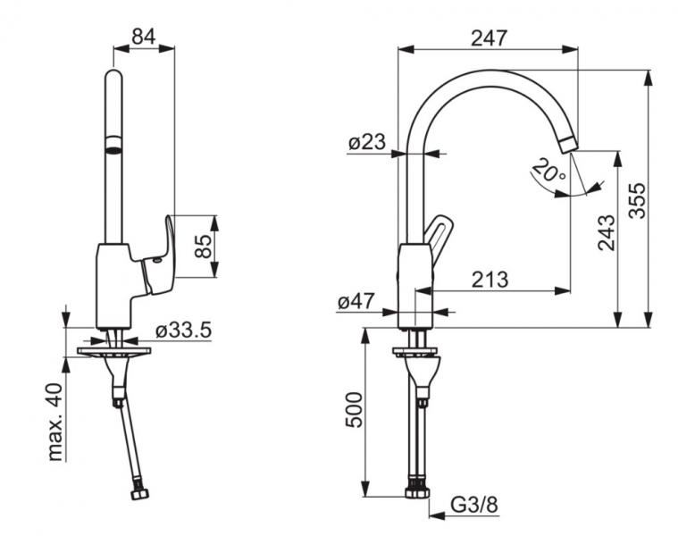 Køkkenarmatur med høj svingtud. Svingradius er 120° som standard (kan begrænses til 0°-60°). Der er mulighed for, at begrænse flow og temperatur på armaturets kartouche. F = fleksible tilslutningsslanger |