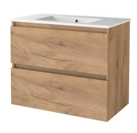 Sanibell Basicline møbelsæt 80 - Whiskey eg Med et Sanibell Basicline badmøbel får du en solid kvalitet. Møblet består af spånplade med melamin som giver en flot og rustik overflade med struktur. Der er abs kantbånd på alle kanter, så møblet er modstandsdygtigt over for den høje luftfugtighed på badeværelset. Møblet har 2 rummelige skuffer med praktiske høje metalsider, øverste skuffe er med udskæring til vandlås for optimal indretning. Begge skuffer er med softclose og kører på metalskinner af god kvalitet der har fuldt udtræk. Skufferne er grebsfri på en supersmart måde, der er ingen skrå kanter, men derimod god plads mellem skuffefront og korpus til at få fat i fronten.