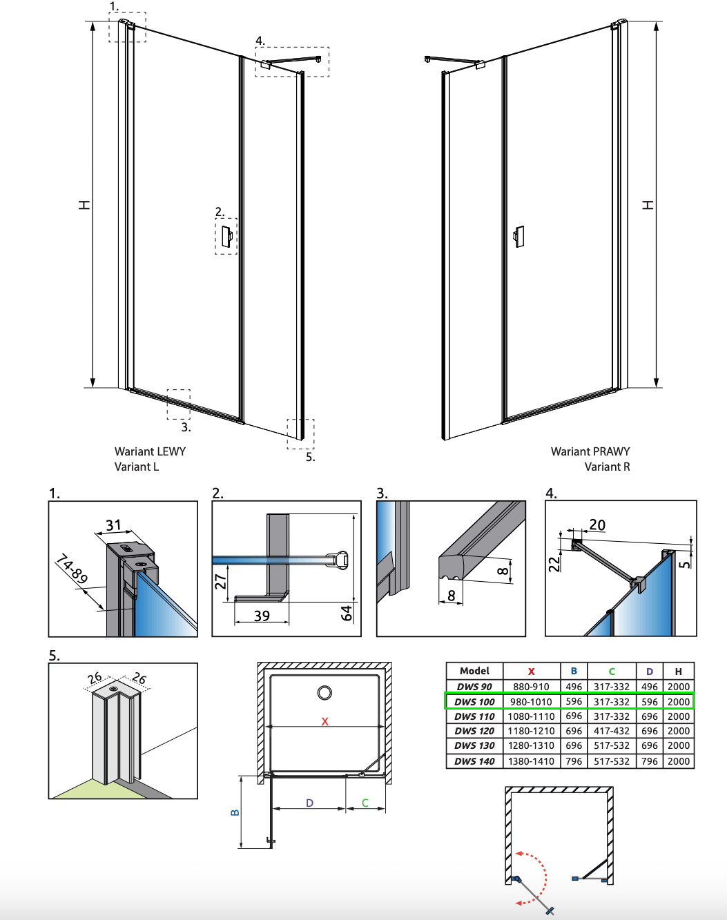 Strømberg Noma 45 svingdør m/sidepanel 1000mm - Venstre - Børstet gunmetal Brusenichedør med fast sidepanel - begge med paneler og greb på døren i børstet gunmetal PVD. Specifikationer: