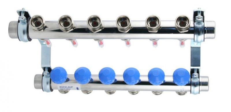 Watts manifold 1" med flowmeter, endesæt med kuglehane,luftskrue og ophængsæt 6 kredse